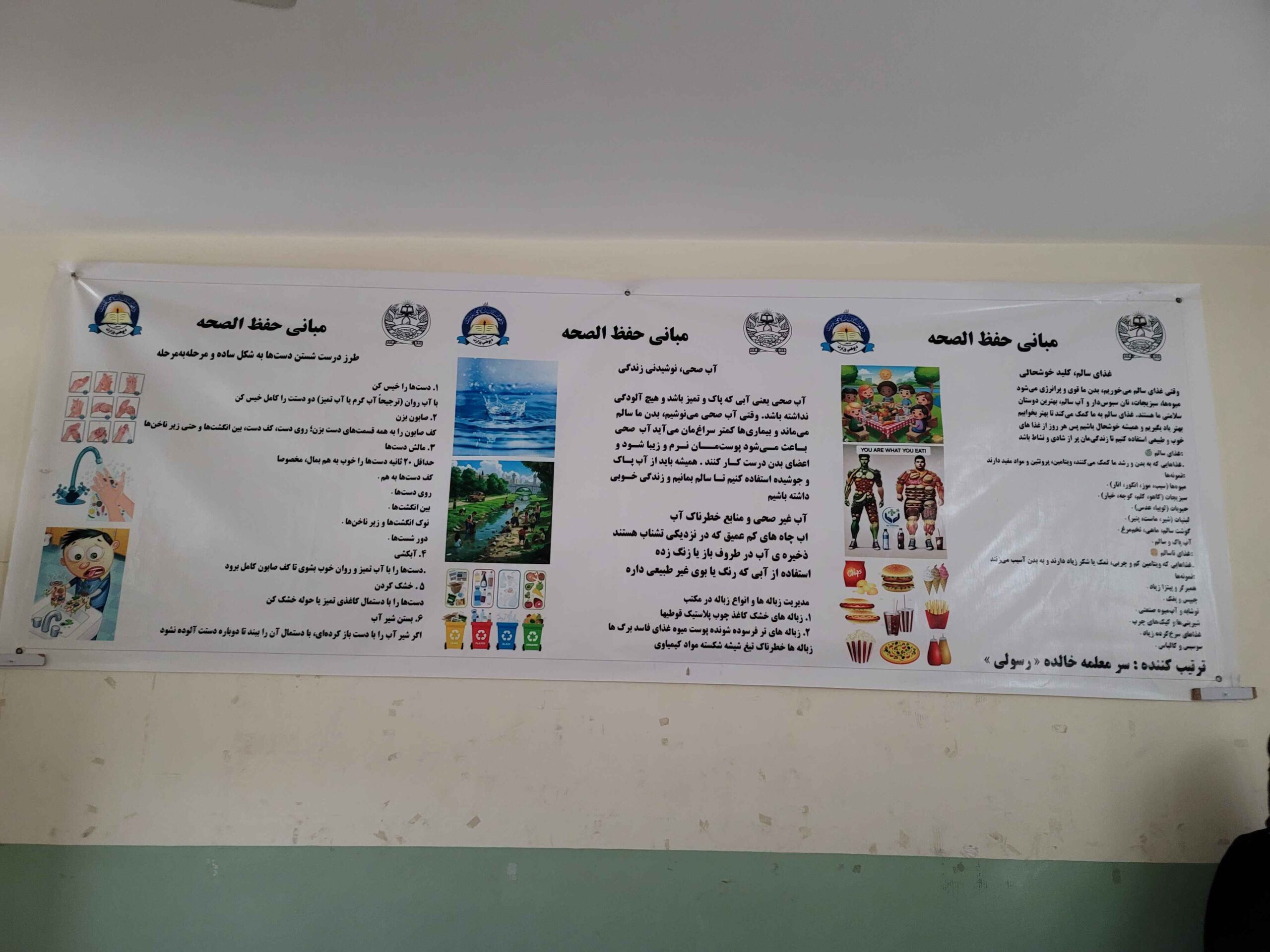Die Gesundheitssituation in Afghanistan ist für viele Menschen schlecht, die Versorgung mit Medikamenten und Ärzten ist schwierig und teuer, für Mädchen und Frauen zusätzlich auch noch mit Restriktionen belegt. Von daher ist es ein wichtiger Teil unsere Arbeit, dass wir die Schulen befähigen, die Themen Hygiene und Gesundheit bewusster anzugehen. Diese Plakat ist in der Parwin Shams Alemi Schule für Jungen und Mädchen in Mazar-e-sharif entstanden.